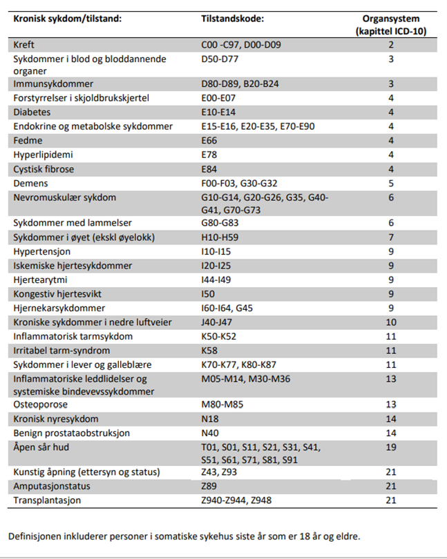 Inkluderingskriterium for vaksne pasientar (≥18 år) med fleire kroniske lidingar (frå Folkehelseinstituttet)