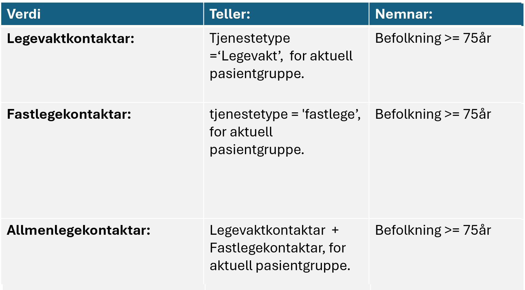 Fastlegekontakt: Ein direkte kontakt mellom fastlege og pasient som inneber ei medisinsk vurdering eller ein samtale. Dette inkluderer konsultasjon (både fysisk, e-konsultasjonar og gruppebehandling, sjukebesøk, tverrfagleg samarbeid, enkel kontakt og anna).